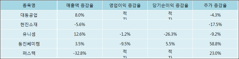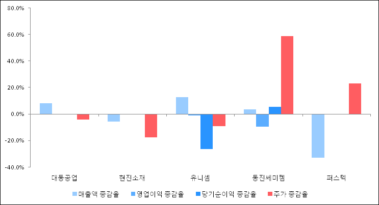 다음은 대동공업과 동일 업종 내 비교 그룹 종목의 각각 최근 실적의 전년 동기 대비 성장률이다. 대동공업의 매출액 증감율은 타 종목 대비 우수한 편이다. 그리고 주가는 하락하였지만 하락율이 비교적 크지는 않았다.