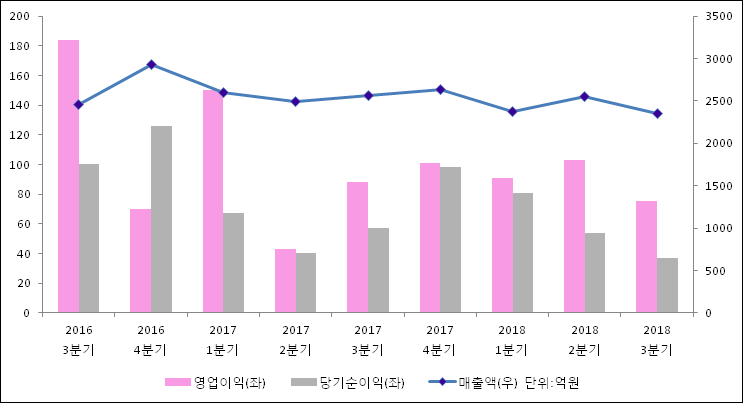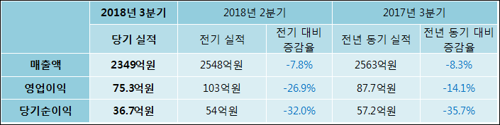 11월 14일 대원강업(000430)의 2018년 3분기 연결 확정 실적이 발표됐다. 작년 동기 대비해서 매출액, 영업이익, 당기순이익 모두 감소하였다. 매출액은 8.34% 감소한 2349억원을, 영업이익은 14.08% 감소하여 75.3억원으로 발표됐다. 당기순이익은 35.72% 줄어들어 36.7억원으로 집계되었다.