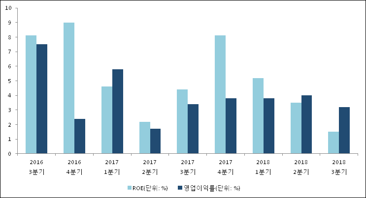 이번분기 기준으로 추정되는 대원강업의 자기자본이익률(ROE)은 1.5%로 나타났다. 이는 최근 일년과 비교했을 때 급락한 수치이다. 3분기 자기자본은 상승하고 당기순이익이 하락하였기 때문이다. 전년 동기인 2017년 3분기 ROE는 4.4%로 이번 분기에 2.9%p 하락했다. 한편 동종목의영업이익률은 3.2%이다. 지난해 동기 영업이익률은 3.4%로 이번 분기와 비슷한 수치이다.