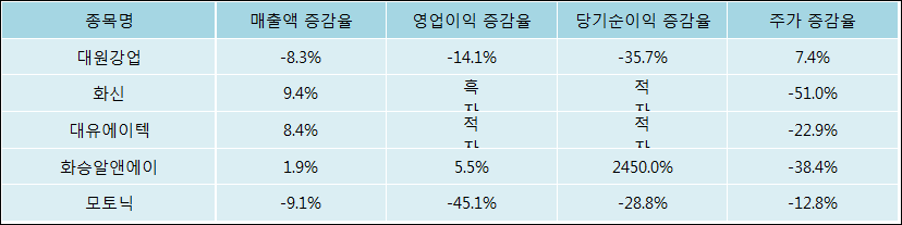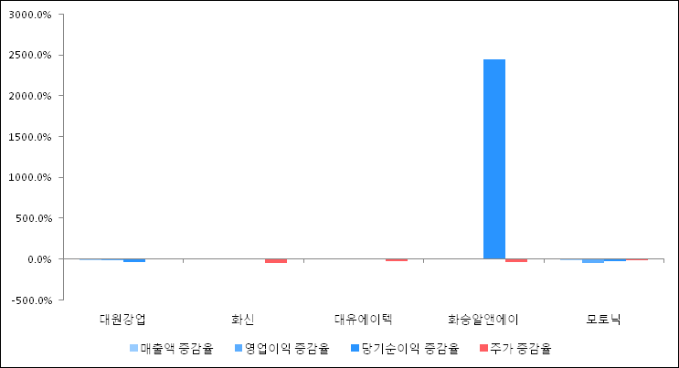 다음은 대원강업과 동일 업종 내 비교 그룹 종목의 각각 최근 실적의 전년 동기 대비 성장률이다. 대원강업의 매출액 증감율은 타 종목 대비 저조한 편이다. 그리고 주가는 가장 높은 상승률을 보였다.