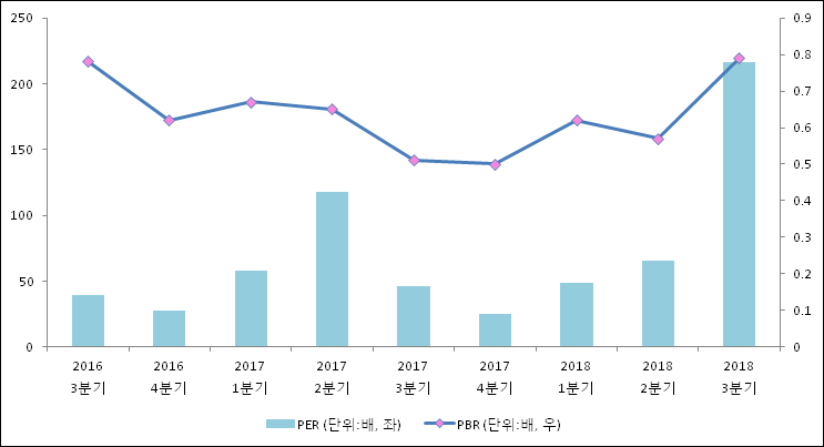 주가가 1주당 수익의 몇배가 되는지 나타내는 주가수익비율(PER)은 216.2배로 나타났다. 이는 최근 일년과 비교했을 때 급등한 수치이다. 3분기 주가는 하락하였으나 EPS의 하락폭이 컸기 때문이다. 전년 동기 PER은 46.56배로 이번 분기에 상승했다.주가가 1주당 순자산의 몇배인지 알려주는 주가순자산비율인 PBR은 0.79배이다. 지난해 동기 PBR은 0.51배로 이번 3분기 PBR이 상승했다.