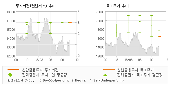 오늘 신한금융투자에서 발표된 '매수(유지)'의견 및 목표주가 16,000원은 전체 컨센서스 대비해서 대체적으로 평균치에 해당하는 수준으로, 이번 의견은 동종목에 대한 전체적인 흐름에서 크게 벗어나지 않은 것으로 파악되며 목표가평균 대비 7.6%정도 미달하고 있는 것으로 집계되었다. 참고로 최근에 목표주가를 가장 공격적으로 제시한 한국투자증권에서 투자의견 '매수(유지)'에 목표주가 18,000원을 제시한 바 있다.