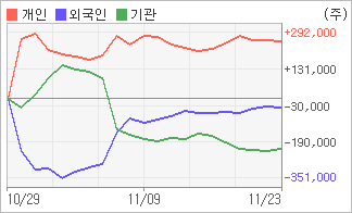 | 외국인과 기관은 순매도, 개인은 순매수(한달누적) 전일 기관이 5,810주를 순매수했고, 외국인은 1,570주를 순매도했다. 4주간을 기준으로 보면 외국인이 매도 후 매수의 관점을 보이고 있음에도 불구하고 35,465주를 순매도했고, 기관도 매도 관점으로 접근하면서 220,697주를 순매도했지만, 개인은 오히려 매기를 떨어뜨리면서도 256,162주를 순매수했다. |