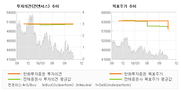 오늘 한화투자증권에서 발표된 'BUY(유지)'의견 및 목표주가 58,000원은 전체 컨센서스 대비해서 대체적으로 평균치에 해당하는 수준으로, 이번 의견은 동종목에 대한 전체적인 흐름에서 크게 벗어나지 않은 것으로 파악되며 목표가평균과 대비해서 미미한 차이가 나는 것으로 집계되었다. 참고로 최근에 목표주가를 가장 공격적으로 제시한 현대차증권에서 투자의견 'BUY'에 목표주가 66,000원을 제일 보수적인 의견을 제시한 메리츠종금증권에서 투자의견 'TRADING BUY'에 목표주가 53,000원을 제시한 바 있다.