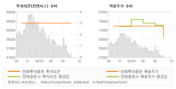 오늘 한화투자증권에서 발표된 'BUY(유지)'의견 및 목표주가 64,000원은 전체 컨센서스 대비해서 대체적으로 평균치에 해당하는 수준으로, 이번 의견은 동종목에 대한 전체적인 흐름에서 크게 벗어나지 않은 것으로 파악되며 목표가평균 대비 10.8%정도 미달하고 있는 것으로 집계되었다. 참고로 최근에 목표주가를 가장 공격적으로 제시한 한국투자증권에서 투자의견 '매수(유지)'에 목표주가 81,000원을 제일 보수적인 의견을 제시한 키움증권에서 투자의견 'OUTPERFORM (MAINTAIN)'에 목표주가 63,000원을 제시한 바 있다.