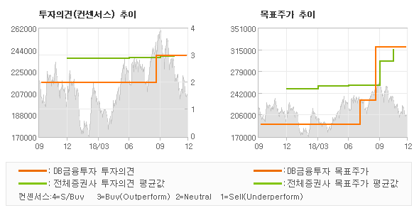 오늘 DB금융투자에서 발표된 'BUY(유지)'의견 및 목표주가 320,000원은 전체 컨센서스 대비해서 대체적으로 평균치에 해당하는 수준으로, 이번 의견은 동종목에 대한 전체적인 흐름에서 크게 벗어나지 않은 것으로 파악되며 목표가평균 대비 3.4% 초과하고 있는 것으로 집계되었다. 참고로 최근에 목표주가를 가장 공격적으로 제시한 하나금융투자에서 투자의견 'BUY'에 목표주가 350,000원을 제일 보수적인 의견을 제시한 KB증권에서 투자의견 'BUY(유지)'에 목표주가 270,000원을 제시한 바 있다.