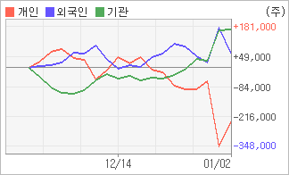 | 외국인/기관 순매수, 개인은 순매도(한달누적) 12월28일부터 전일까지 기관이 2거래일 연속 순매수했다. 4주간을 기준으로 보면 외국인이 초반에 동종목을 순매수한 이후에 기세를 이어가며 69,494주를 순매수했고, 기관도 순매도를 기록하다가 다시 순매수로 돌아서면서 169,226주를 순매수했다. 반면 개인들은 매도 우위로 반전되면서 238,720주를 순매도한 것으로 나타났다. |