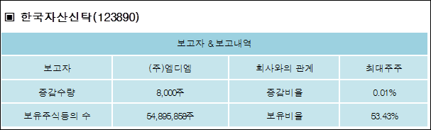한국자산신탁(123890)은 03일 최대주주 (주)엠디엠을 비롯한 특별관계자의 보유주식이 증가되었다고 발표했다. 이는 직전 보고일보다 8,000주 증가하여 지분율은 53.43%로 상승했다. 이번 보고 사유는 특별관계자의장내매수에 따른 변동사항보고로 알려졌다.