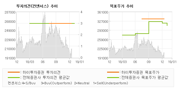 오늘 하이투자증권에서 발표된 'BUY (MAINTAIN)'의견 및 목표주가 335,000원은 전체의견에 수렴하면서 시장의 평균적인 기대감이 비교적 객관적으로 표현된 것으로 풀이되며 목표가평균 대비 8.5% 초과하고 있는 것으로 집계되었다. 참고로 최근에 목표주가를 가장 공격적으로 제시한 한화투자증권에서 투자의견 'BUY(유지)'에 목표주가 350,000원을 제일 보수적인 의견을 제시한 신한금융투자에서 투자의견 '매수(유지)'에 목표주가 270,000원을 제시한 바 있다.