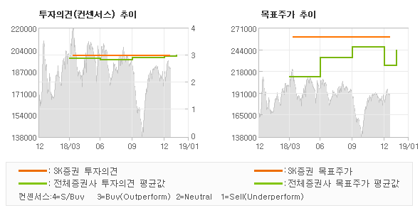 SK증권의 동종목에 대한 최근 6개월 동안의 투자의견은 전체적으로 큰 변화없이 유지되고 있다. 목표주가는 2017년12월 180,000원이 저점으로 제시된 이후 이번에 발표된 260,000원까지 꾸준하게 상향조정되어 왔다.