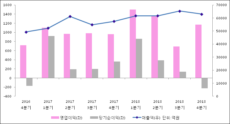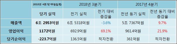 1월 30일 포스코대우(047050)의 2018년 4분기 연결 잠정 실적이 발표됐다. 작년 동기 대비해서 매출액은 9.7% 늘어나서 6조 2953억원을 기록했다. 영업이익은 21.9% 증가하여 1172억원을 달성했다. 당기순이익은 -223.7억원으로 361억원에서 적자전환되었다.