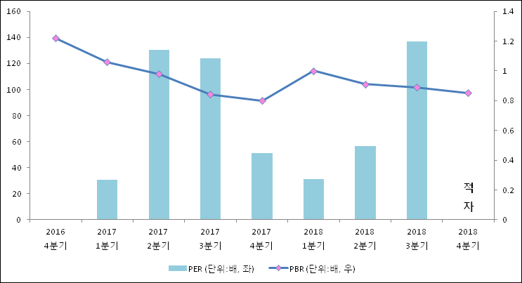 주가가 1주당 순자산의 몇배인지 알려주는 주가순자산비율인 PBR은 0.85배이다. PBR은 최근 3분기 이상 연속으로 하락하고 있다. 지난해 동기 PBR은 0.8배로 이번 분기와 비슷한 수치이다.