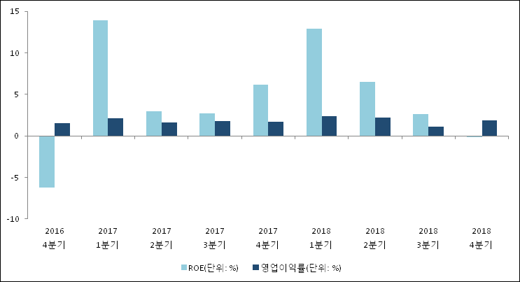이번분기 기준으로 추정되는 포스코대우의 자기자본이익률(ROE)은 -0.2%로 나타났다. ROE는 최근 3분기 이상 연속으로 하락했다. 전년 동기인 2017년 4분기 ROE는 6.2%로 이번 분기에 6.4%p 하락했다. 한편 동종목의영업이익률은 1.9%이다. 지난해 동기 영업이익률은 1.7%로 이번 4분기가 0.2%p 상승했다.