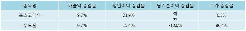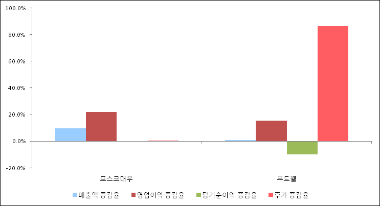 다음은 포스코대우와 동일 업종 내 비교 그룹 종목의 각각 최근 실적의 전년 동기 대비 성장률이다. 포스코대우의 매출액 증감율은 타 종목 대비 가장 우수한 편이다. 그리고 주가는 가장 높은 상승률을 보였다.