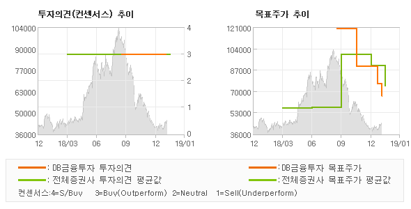 DB금융투자의 동종목에 대한 최근 6개월 동안의 투자의견은 전체적으로 큰 변화없이 유지되고 있다. 목표주가는 2018년9월 120,000원까지 높아졌다가 2019년1월 76,000원을 최저점으로 목표가가 제시된 이후 최근에 66,000원으로 새롭게 조정되고 있다.