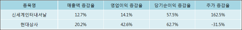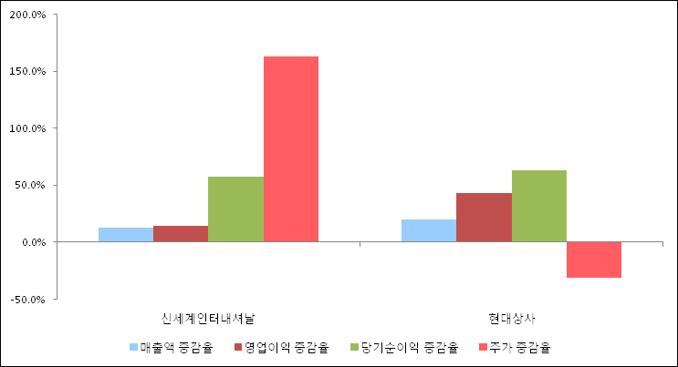 다음은 신세계인터내셔날과 동일 업종 내 비교 그룹 종목의 각각 최근 실적의 전년 동기 대비 성장률이다. 신세계인터내셔날의 매출액 증감율은 타 종목 대비 가장 우수한 편이다. 그리고 주가는 가장 높은 상승률을 보였다.