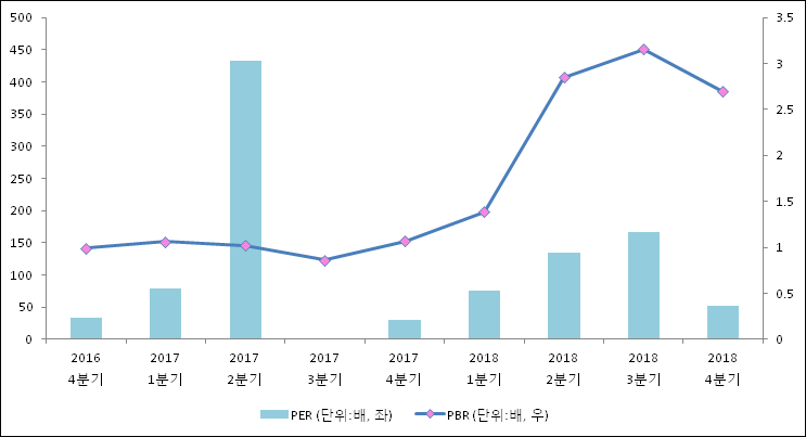 주가가 1주당 수익의 몇배가 되는지 나타내는 주가수익비율(PER)은 52.6배로 나타났다. PER은 최근 3분기 이상 꾸준히 상승하다가 이번 분기에 하락했다. 전년 동기 PER은 30.11배로 이번 분기에 상승했다.주가가 1주당 순자산의 몇배인지 알려주는 주가순자산비율인 PBR은 2.69배이다. PBR은 최근 4분기 이상 꾸준히 상승하다가 이번 분기에는 하락했다. 지난해 동기 PBR은 1.07배로 이번 4분기 PBR이 상승했다.