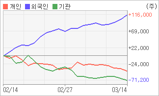 | 기관과 개인은 순매도, 외국인은 순매수(한달누적) 기관이 2일연속 주식을 팔고 있는 반면 외국인은 4일연속 주식을 사고 있다. 4주간을 기준으로 보면 외국인이 초반에 동종목을 순매수한 이후에 기세를 이어가며 115,678주를 순매수한 반면, 기관은 매도 관점으로 접근하면서 71,185주를 순매도했고, 개인들도 매도쪽으로 방향을 잡으면서 44,179주를 순매도한 것으로 집계됐다. |