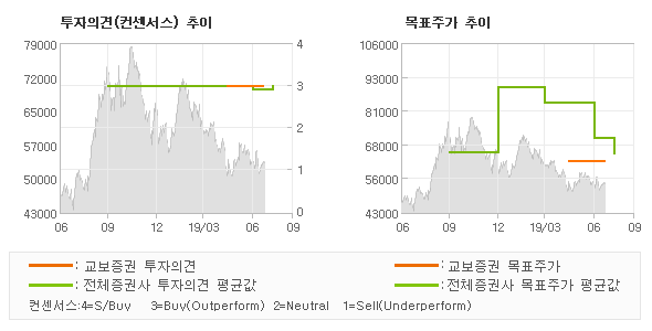오늘 교보증권에서 발표된 'BUY(유지)'의견 및 목표주가 62,000원은 전체의견에 수렴하면서 시장의 평균적인 기대감이 비교적 객관적으로 표현된 것으로 풀이되며 목표가평균 대비 10.2%정도 미달하고 있는 것으로 집계되었다. 참고로 최근에 목표주가를 가장 공격적으로 제시한 현대차증권에서 투자의견 'BUY(유지)'에 목표주가 80,000원을 제일 보수적인 의견을 제시한 하나금융투자에서 투자의견 'NEUTRAL(하향)'에 목표주가 59,000원을 제시한 바 있다.