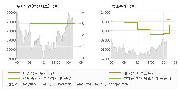 오늘 대신증권에서 발표된 'BUY(신규)'의견 및 목표주가 110,000원은 전체의견에 수렴하면서 시장의 평균적인 기대감이 비교적 객관적으로 표현된 것으로 풀이되며 목표가평균 대비 16.8% 초과하고 있는 것으로 집계되었다. 참고로 최근 증권사 매매의견 중에서 제일 보수적인 의견을 제시한 현대차증권에서 투자의견 'BUY'에 목표주가 85,000원을 제시한 바 있다.