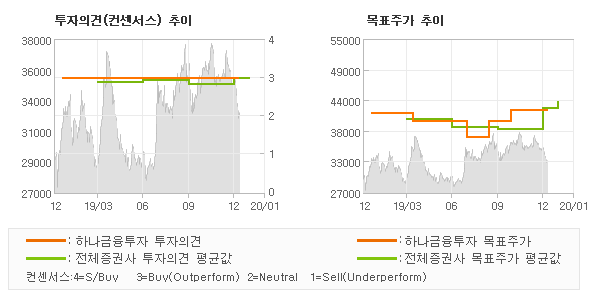 하나금융투자의 동종목에 대한 최근 1년동안의 투자의견은 전체적으로 큰 변화없이 유지되고 있다. 목표주가는 2019년1월 37,000원이 저점으로 제시된 이후에 최근에는 42,000원까지 상향조정되고 있다.