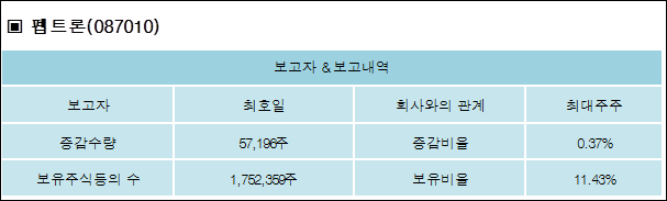 다음은 펩트론의 지분 변동 내역과 보유 내역이다.