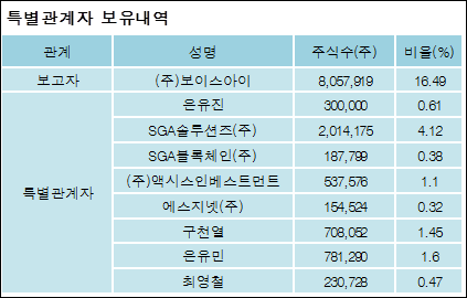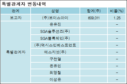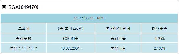 SGA(049470)는 29일 최대주주 (주)보이스아이를 비롯한 특별관계자의 보유주식이 증가되었다고 발표했다. 이는 직전 보고일보다 609,011주 증가하여 지분율은 27.35%로 상승했다. 이번 보고 사유는 최대주주의지분추가취득으로 알려졌다.