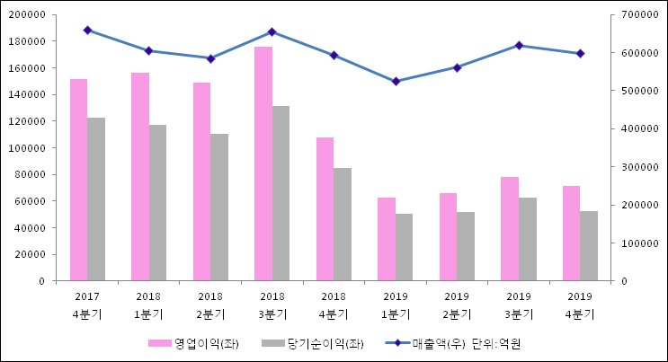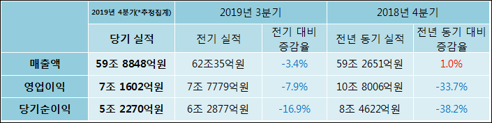 1월 30일 삼성전자(005930)의 2019년 연간 실적 대량변동 보고서(잠정집계)가 발표됐다. 이를 근거로 4분기 실적을 추정해보면, 매출액은 작년 동기 대비해서 1% 신장된 59조 8848억원으로 발표되었다. 매출액 증가에도 불구하고영업이익은 33.7% 감소하여 7조 1602억원으로, 당기순이익은 38.2% 줄어들어 5조 2270억원으로 기록 되었다.