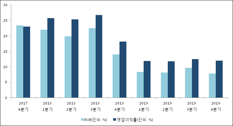이번분기 기준으로 추정되는 삼성전자의 자기자본이익률(ROE)은 23.4%로 나타났다. 이는 최근 일년과 비교했을 때 급등한 수치이다. 4분기 자기자본은 하락하고 당기순이익이 상승하였기 때문이다. 전년 동기인 2018년 4분기 ROE는 8.4%로 이번 분기에 15%p 상승했다. 한편 동종목의영업이익률은 23%이다. 지난해 동기 영업이익률은 11.9%로 이번 4분기가 11.1%p 상승했다.