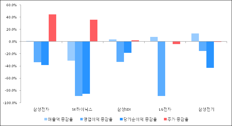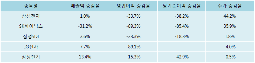 다음은 삼성전자와 동일 업종 내 비교 그룹 종목의 각각 최근 실적의 전년 동기 대비 성장률이다. 삼성전자의 매출액은 증가했지만 증감율은 타 종목 대비 저조한 편이다. 그리고 주가는 가장 높은 상승률을 보였다.