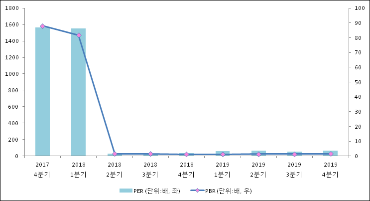 주가가 1주당 수익의 몇배가 되는지 나타내는 주가수익비율(PER)은 1564.2배로 나타났다. 이는 최근 일년과 비교했을 때 급등한 수치이다. 4분기 EPS는 상승하였으나 주가 상승폭이 더 컸기 때문이다. 전년 동기 PER은 59.38배로 이번 분기에 상승했다.주가가 1주당 순자산의 몇배인지 알려주는 주가순자산비율인 PBR은 87.95배이다. PBR은 최근 5분기 이상 꾸준히 상승하고 있다. 지난해 동기 PBR은 1.24배로 이번 4분기 PBR이 상승했다.