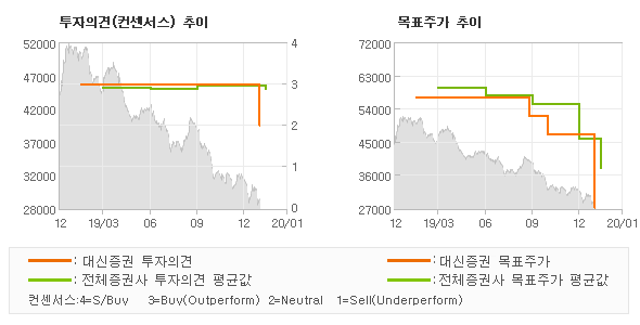 대신증권의 동종목에 대한 최근 1년동안의 투자의견은 전체적으로 조금 하향조정되고 있다. 목표주가는 2019년2월 57,000원까지 높아졌다가 2019년10월 47,000원을 최저점으로 목표가가 제시된 이후 최근에 27,000원으로 새롭게 조정되고 있다.