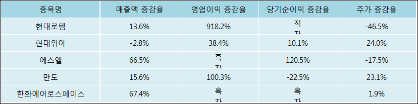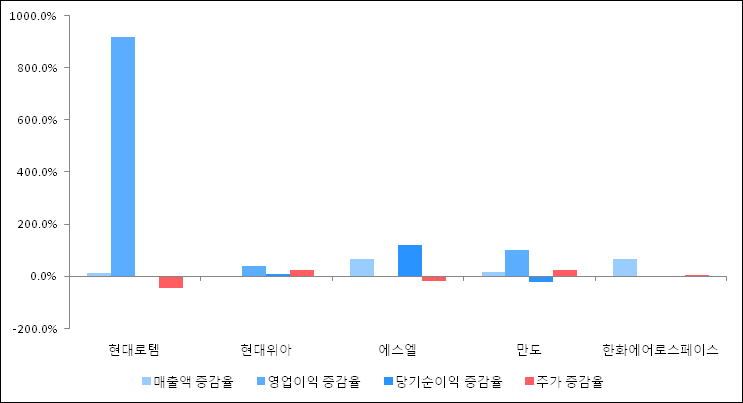 다음은 현대로템과 동일 업종 내 비교 그룹 종목의 각각 최근 실적의 전년 동기 대비 성장률이다. 현대로템의 매출액은 증가했지만 증감율은 타 종목 대비 저조한 편이다. 그리고 주가의 하락율이 가장 큰 편으로 나타났다.