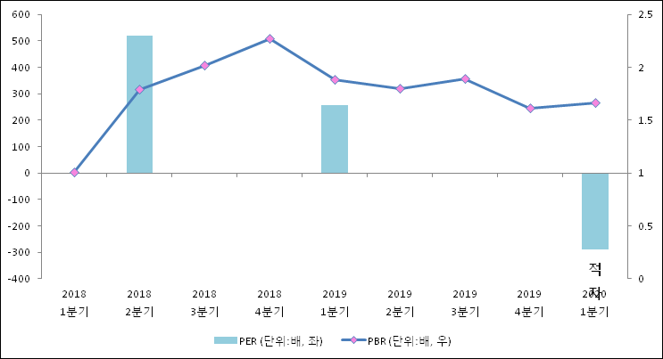 주가가 1주당 순자산의 몇배인지 알려주는 주가순자산비율인 PBR은 1.66배이다. 지난해 동기 PBR은 1.88배로 이번 1분기 PBR이 하락했다.