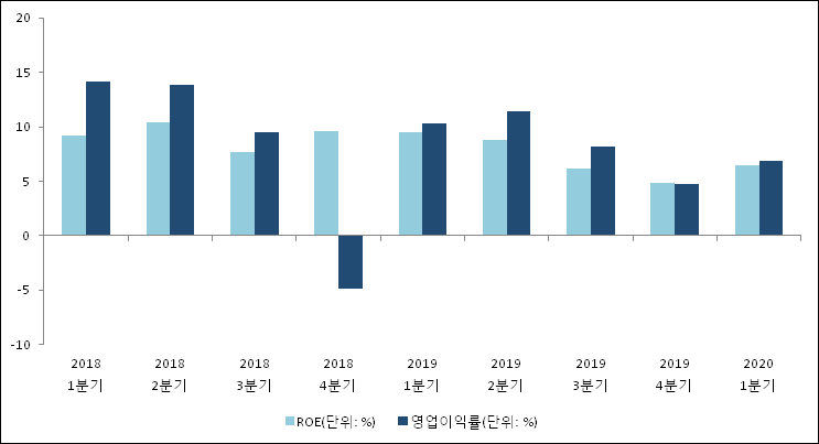 이번분기 기준으로 추정되는 DGB금융지주의 자기자본이익률(ROE)은 9.2%로 나타났다. ROE는 4분기 이상 연속으로 하락하다 저번 분기부터 반등하여 이번 분기에도 상승했다. 전년 동기인 2019년 1분기 ROE는 8.8%이다. 한편 동종목의영업이익률은 14.1%이다. 지난해 동기 영업이익률은 11.4%로 이번 1분기가 2.7%p 상승했다.
