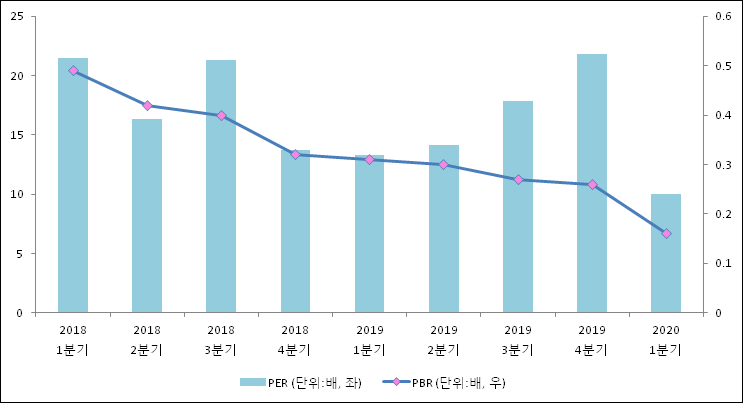 주가가 1주당 수익의 몇배가 되는지 나타내는 주가수익비율(PER)은 21.5배로 나타났다. 전년 동기 PER은 14.1배로 이번 분기에 상승했다.주가가 1주당 순자산의 몇배인지 알려주는 주가순자산비율인 PBR은 0.49배이다. PBR은 최근 7분기 이상 연속으로 하락하다가 이번 분기에 상승했다. 지난해 동기 PBR은 0.3배로 이번 1분기 PBR이 상승했다.