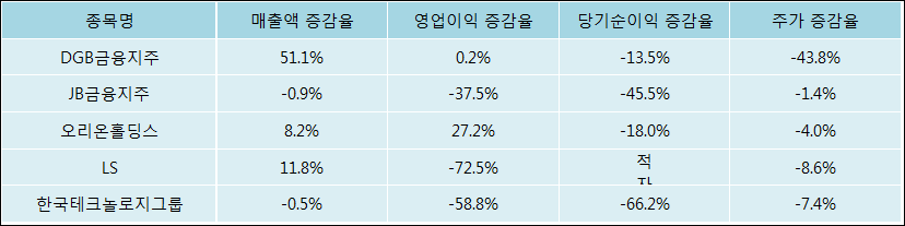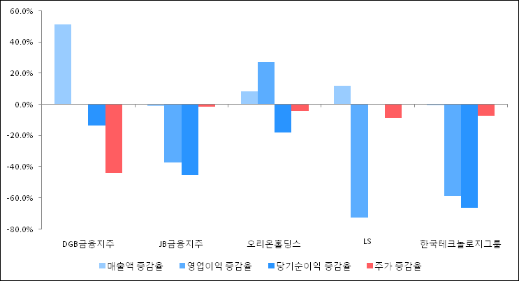 다음은 DGB금융지주와 동일 업종 내 비교 그룹 종목의 각각 최근 실적의 전년 동기 대비 성장률이다. DGB금융지주의 매출액 증감율은 타 종목 대비 가장 우수한 편이다. 그리고 주가의 하락율이 가장 큰 편으로 나타났다.