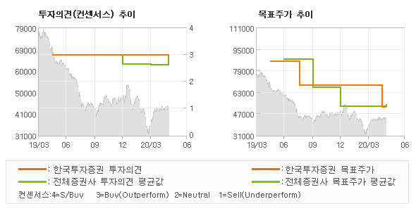 한국투자증권의 동종목에 대한 최근 1년동안의 투자의견은 전체적으로 큰 변화없이 유지되고 있다. 목표주가는 2019년5월 86,000원까지 높아졌다가 2020년5월 52,000원을 최저점으로 목표가가 제시된 이후 최근에도 52,000원으로 제시되고 있다.