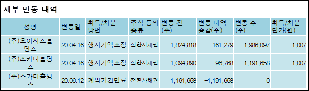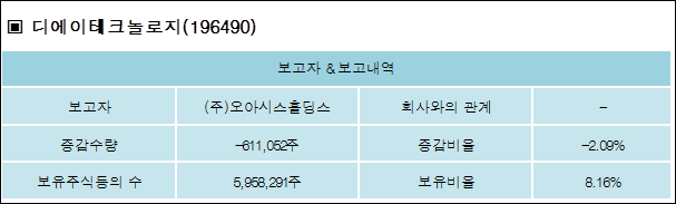 디에이테크놀로지(196490)는 18일 - (주)오아시스홀딩스를 비롯한 특별관계자의 보유주식이 감소되었다고 발표했다. 이는 직전 보고일보다 611,052주 감소하여 지분율은 8.16%로 하락했다. 이번 보고 사유는 콜옵션계약기간만료로 알려졌다.