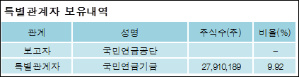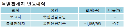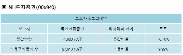 NH투자증권(005940)은 10일 주주 국민연금공단을 비롯한 특별관계자의 보유주식이 감소되었다고 발표했다. 이는 직전 보고일보다 1,966,763주 감소하여 지분율은 9.92%로 하락했다. 이번 보고 사유는 단순투자목적에서일반투자목적으로보유목적변경으로 알려졌다.