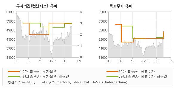 오늘 유안타증권에서 발표된 'BUY'의견 및 목표주가 60,000원은 전체 컨센서스 대비해서 대체적으로 평균치에 해당하는 수준으로, 이번 의견은 동종목에 대한 전체적인 흐름에서 크게 벗어나지 않은 것으로 파악되며 목표가평균 대비 3% 초과하고 있는 것으로 집계되었다. 참고로 최근에 목표주가를 가장 공격적으로 제시한 한국투자증권은 투자의견 'BUY(유지)'에 목표주가 65,000원을 제일 보수적인 의견을 제시한 SK증권은 투자의견 'BUY(유지)'에 목표주가 48,000원을 제시한 바 있다.