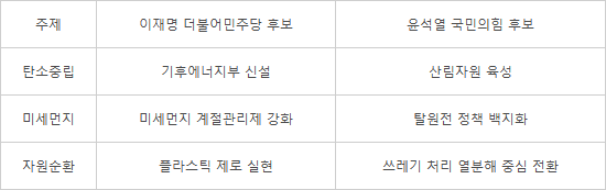 이 후보는 환경 분야 주요 공약으로 △기후에너지부 신설·그린산업 강국 △스마트 클린 도시 확대 △플라스틱 제로 실현을 제시했다. 반면 윤 후보는 △산림자원 육성과 탄소중립 △탈석탄 일정 앞당기기 △쓰레기 처리 열분해 중심 전환을 달성하겠다고 약속했다.