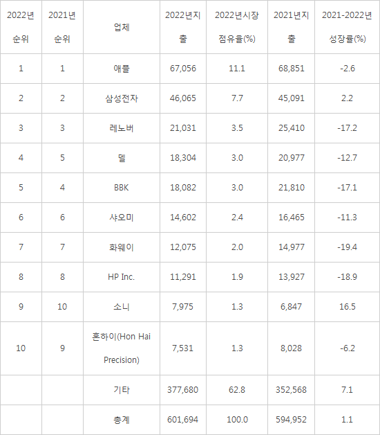세계적인 인플레이션과 경기침체 압력으로 PC·스마트폰 수요가 급감해 애플·삼성전자·레노버·델·BBK·샤오미·화웨이·HP 등이 반도체 구매를 줄였다고 가트너는 설명했다.