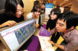 <“지금은 웹 앱 시대.” 2007년부터 ‘웹 앱’이 정보통신기술업계의 중심에 자리 잡기 시작했다. 2008년 10월 23일 업계 관계자가 ‘제2회 웹앱스콘(웹 애플리케이션 콘퍼런스)’에 전시한 앱 작동 상태를 살피고 있다.>
