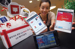 <“UX 많~이 드려요.” 2012년 10월 15일 LG전자가 ‘옵티머스 뷰 2’용 UX 꾸러미를 선보였다.>
