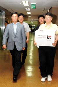 <“더 많이 갖고 싶은데….” 2011년 7월 28일 한국 첫 주파수 경매에 참여하기 위해 신청서를 들고 방송통신위원회로 들어선 KT 직원들.>