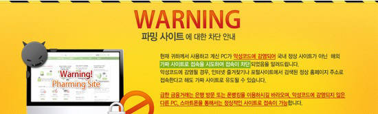 <파밍 사이트 차단 안내 스크린 캡쳐>