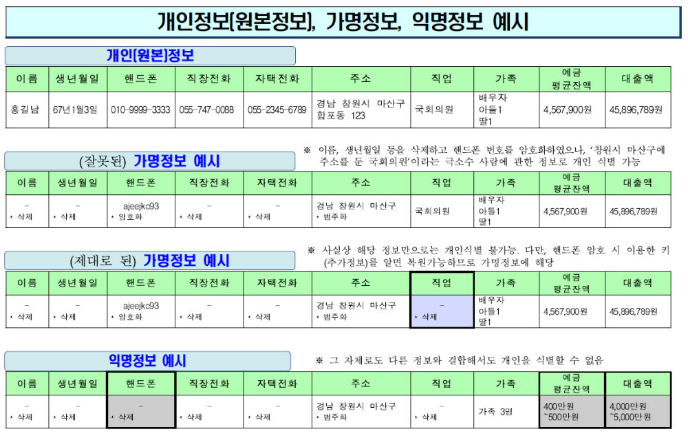 다만 가명정보를 결합하면 결합할수록 개인을 식별할 수 있다는 가능성이 있다. 개인정보보호위원회는 가이드라인을 마련, 개인정보 처리 기본원칙을 준수하고 식별 가능성이 큰 정보는 삭제하거나 기존 정보로 복원할 수 없도록 했다. 또 보안 수준이 낮은 환경에서는 익명정보에 가깝게 처리, 식별 가능성을 낮춘다.